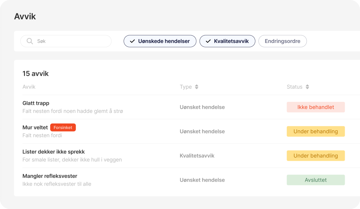Det er enkelt for ansatte å melde inn avvik der de er, og du får full oversikt over avvik, tiltak og dokumentasjon.